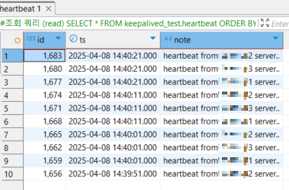- 각 서버에서 쉘 스크립트를 통해 10초에 1번씩 heartbeat 개념의 insert(write)를 실행한다.(heartbeat.sh)