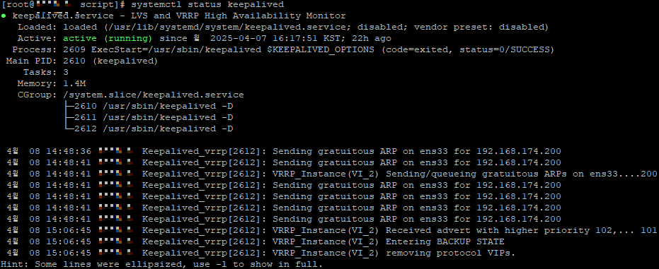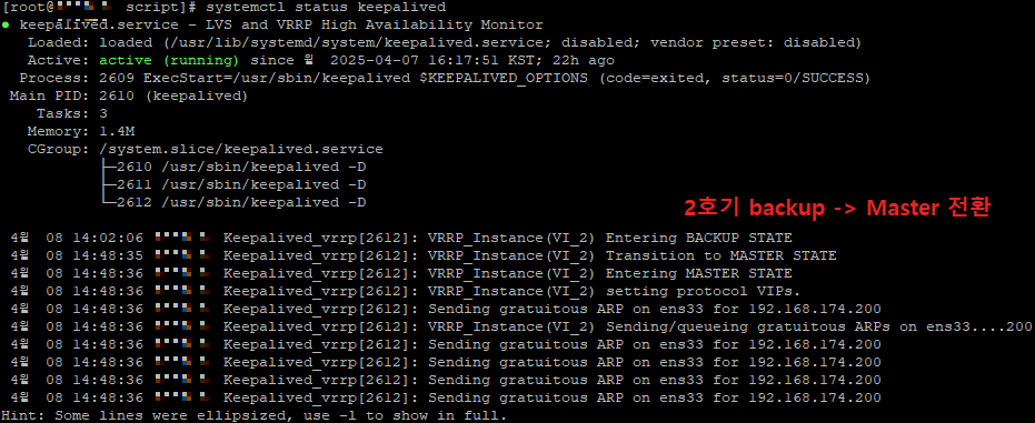 - 2호기 keepalived status 확인 (backup->Master 전환)