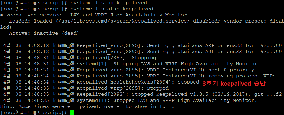 - 3호기 keepalived가 다운되어도 사전 설정된 vip를 통해 2호기로 failover가 일어나는 지 확인