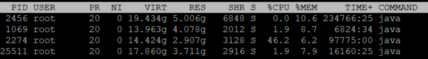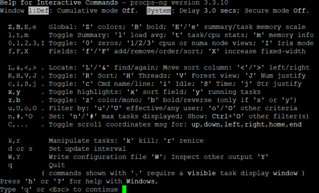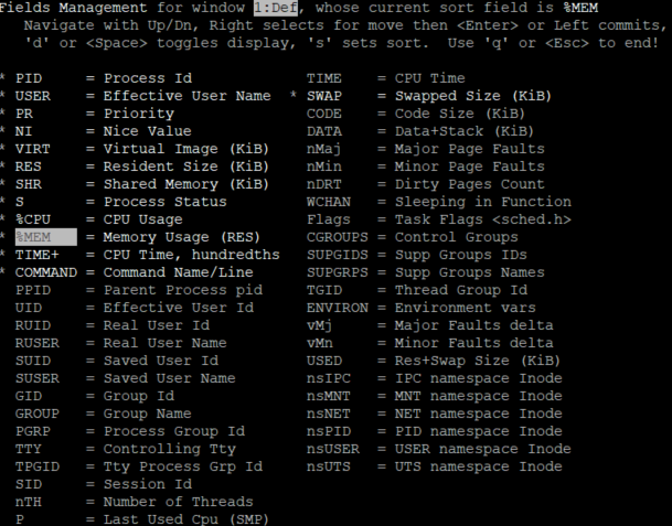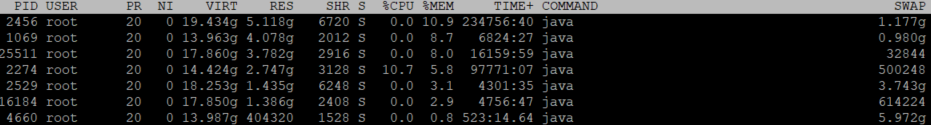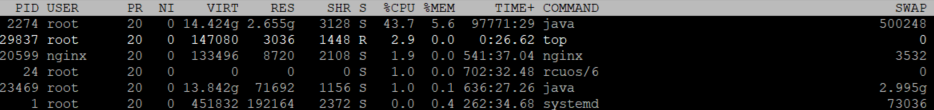 - top는 리눅스 운영체제에서 사용하는 모니터링 도구이다. 서버의 리소스 등을 모니터링할 수 있으며, 프로세스 별 pid, 사용자, CPU 점유율, Memory 사용량, swap 메모리 사용량 등을 확인할 수 있다.