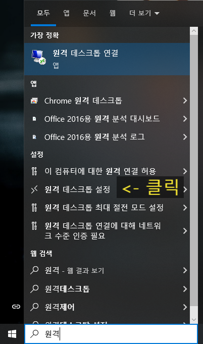 - 원격 연결을 허용할 PC에서 시작메뉴 옆 검색 - 원격 데스크톱 설정