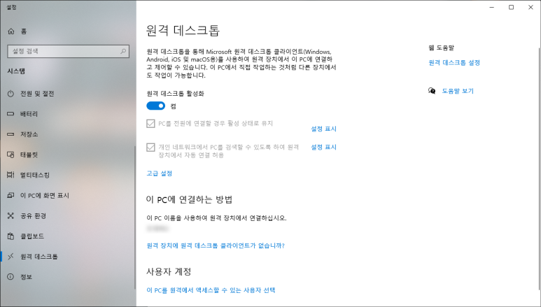 - Windows 원격 데스크톱 연결 (Windows 10 Pro 기준)