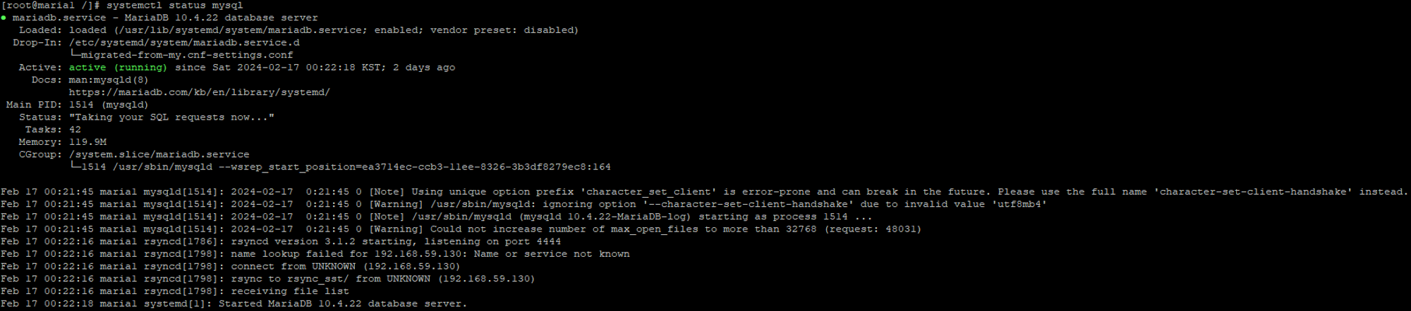 ** 2,3번 서버의 mysql 서비스 status가 모두 active로 바뀌었음