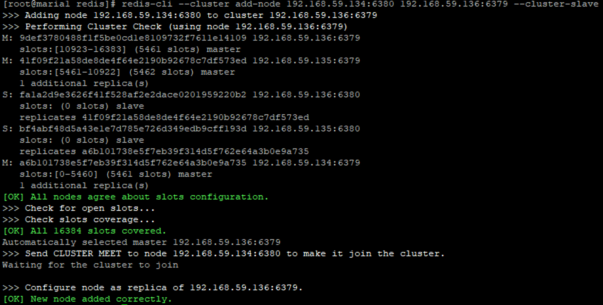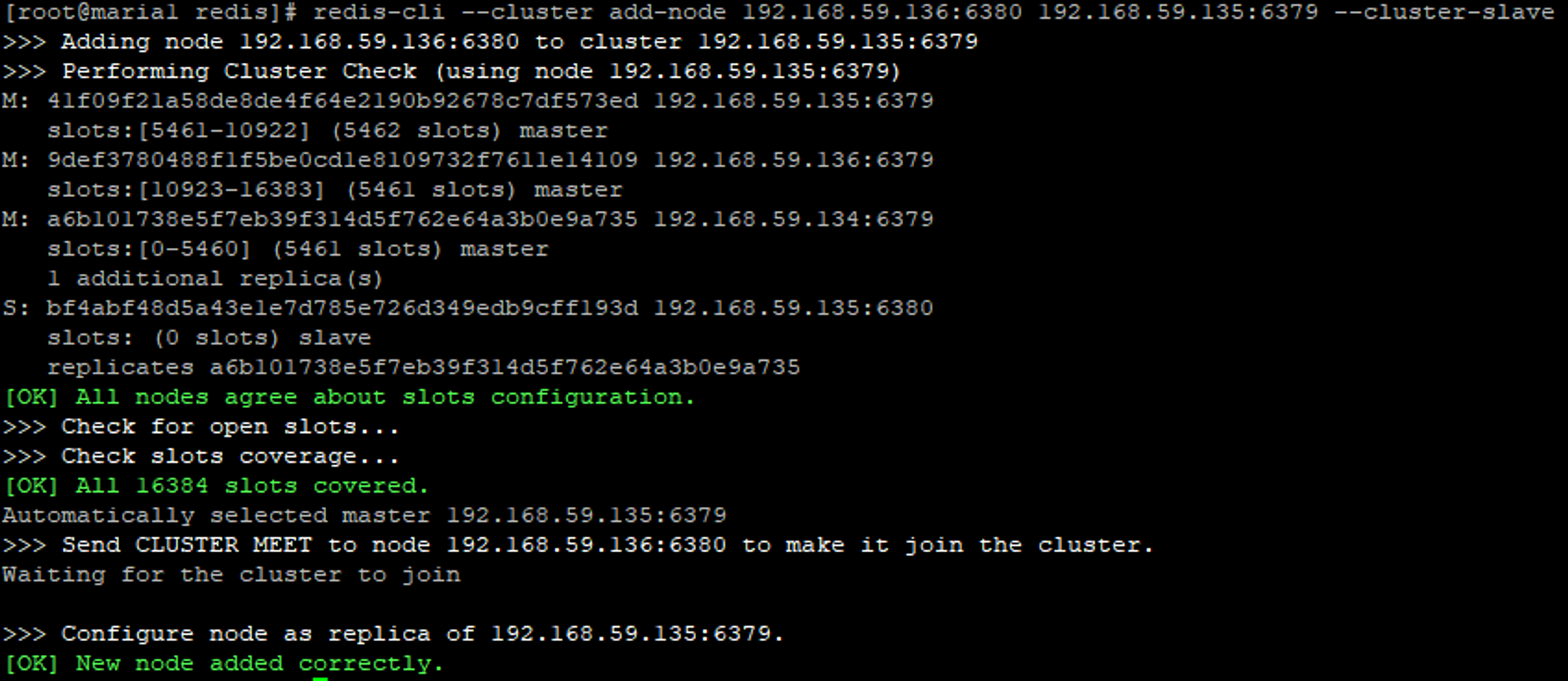 redis-cli --cluster add-node 192.168.59.136:6380 192.168.59.135:6379 --cluster-slave //slave 노드 추가