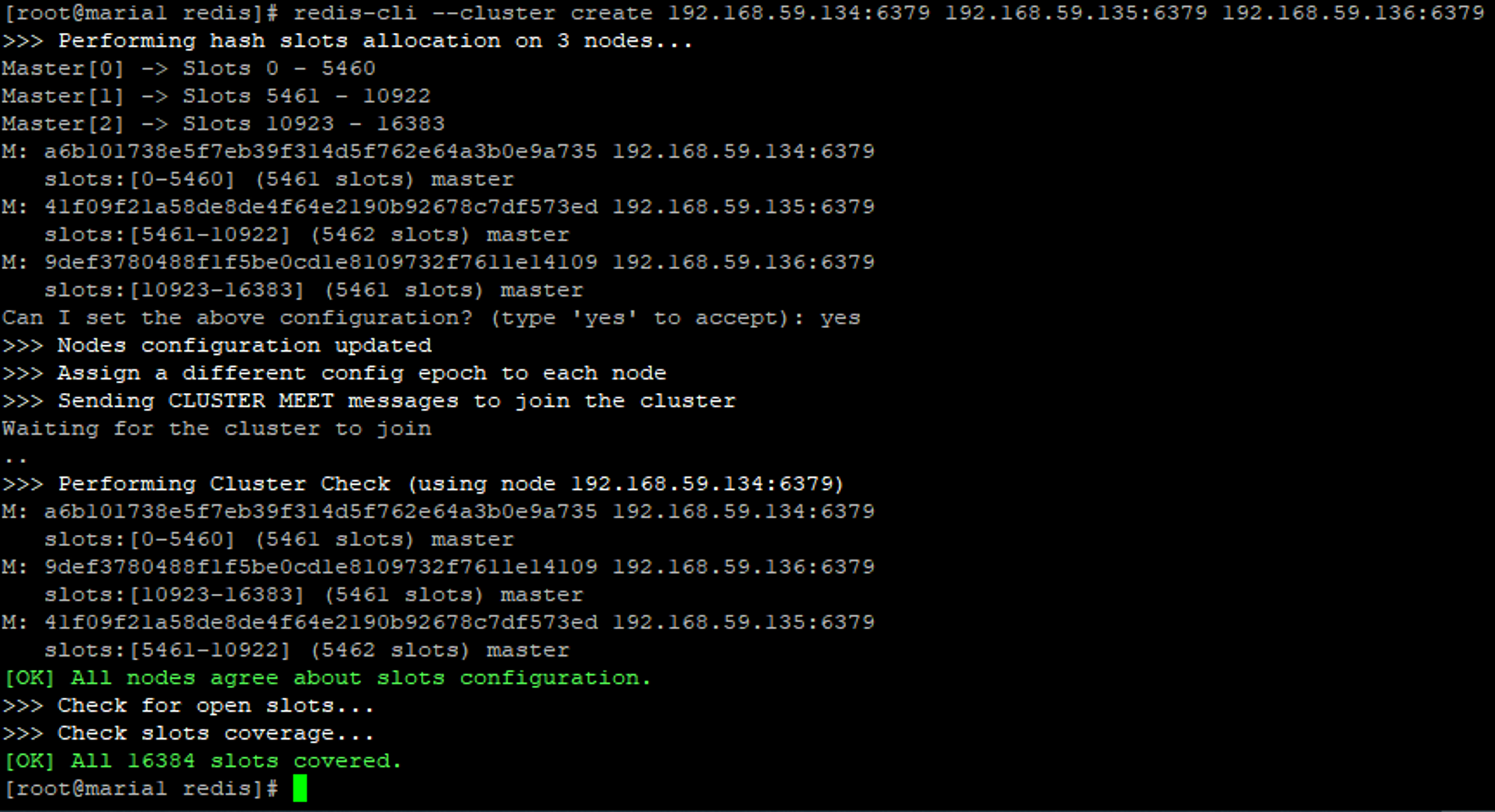 redis-cli --cluster create 192.168.59.134:6379 192.168.59.135:6379 192.168.59.136:6379