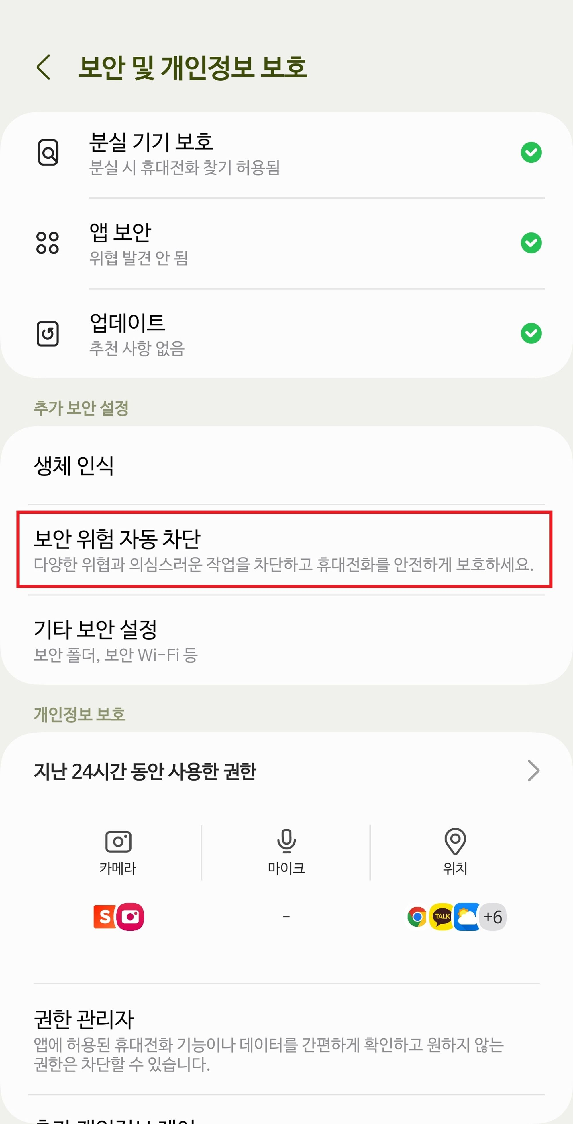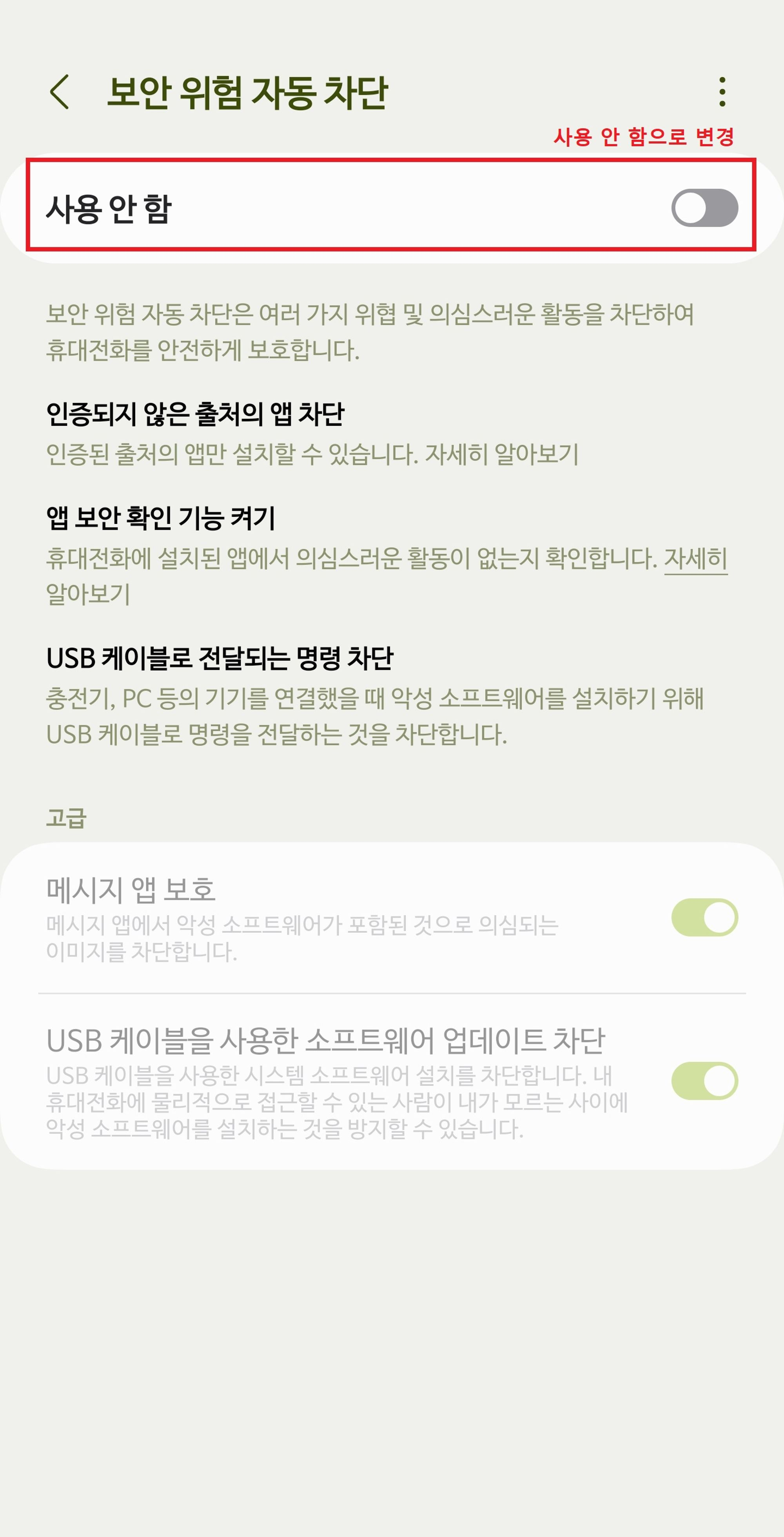 - 보안위험자동차단 기능 해제
