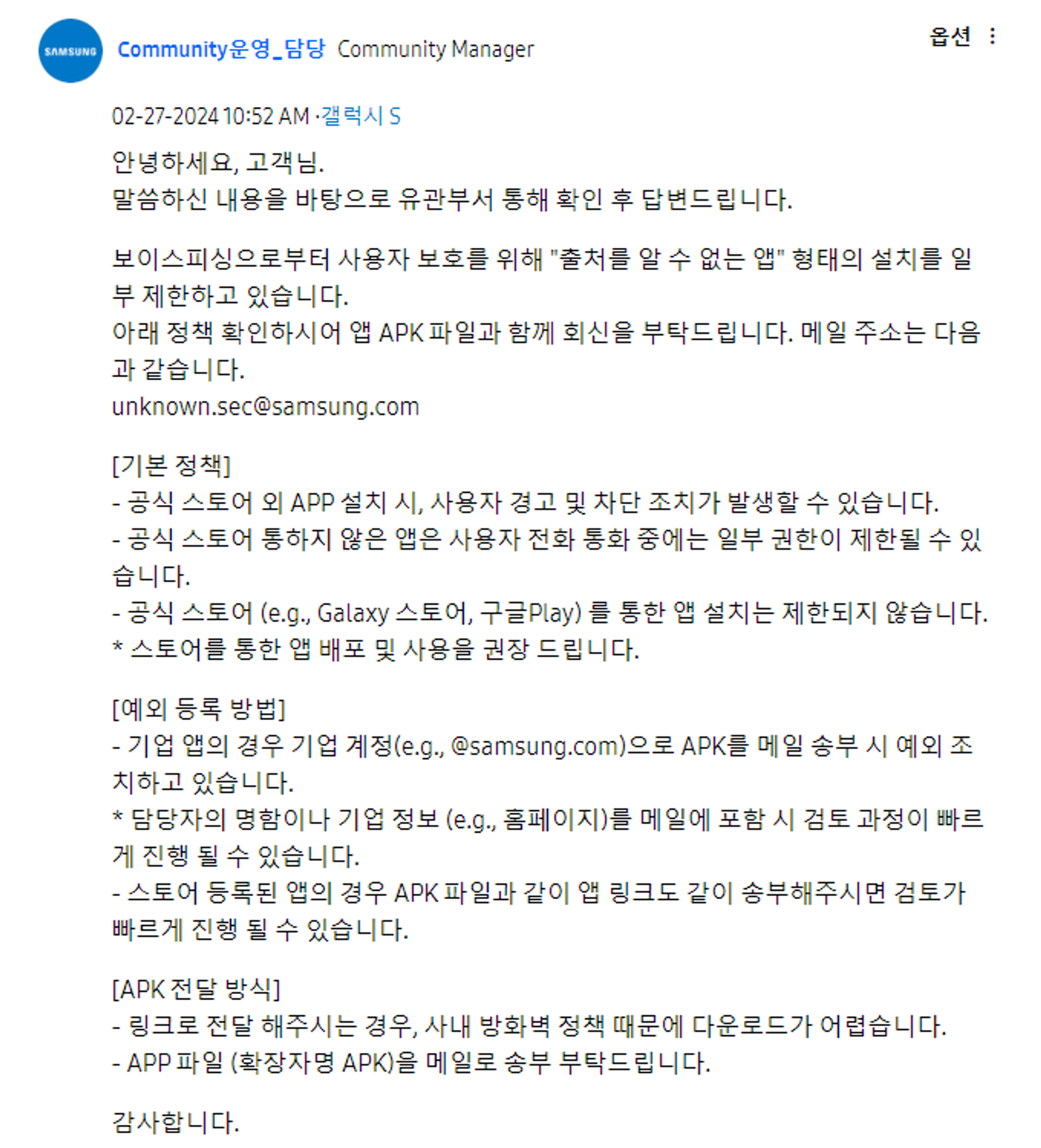 - 관련 삼성전자 답변