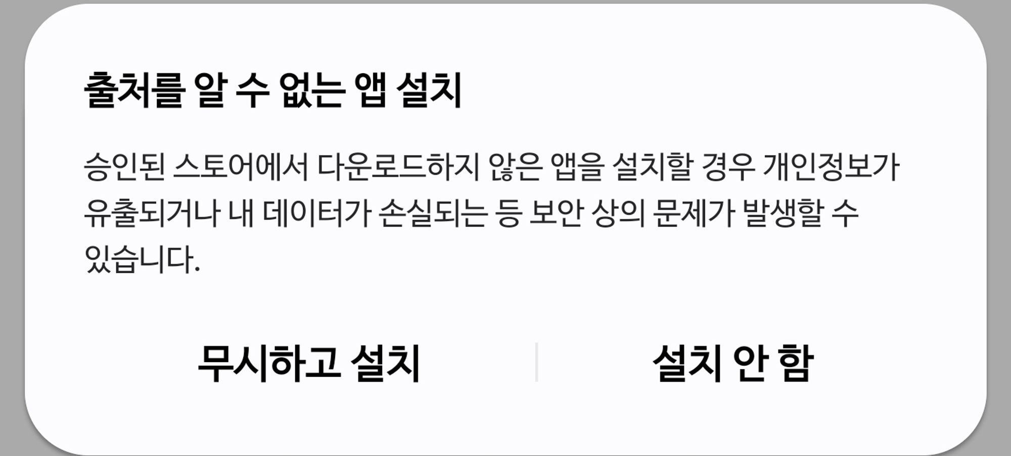 - 이후 apk 파일을 별도로 다운로드받아 설치 시에 출처를 알 수 없는 앱 설치 팝업이 뜬다.
