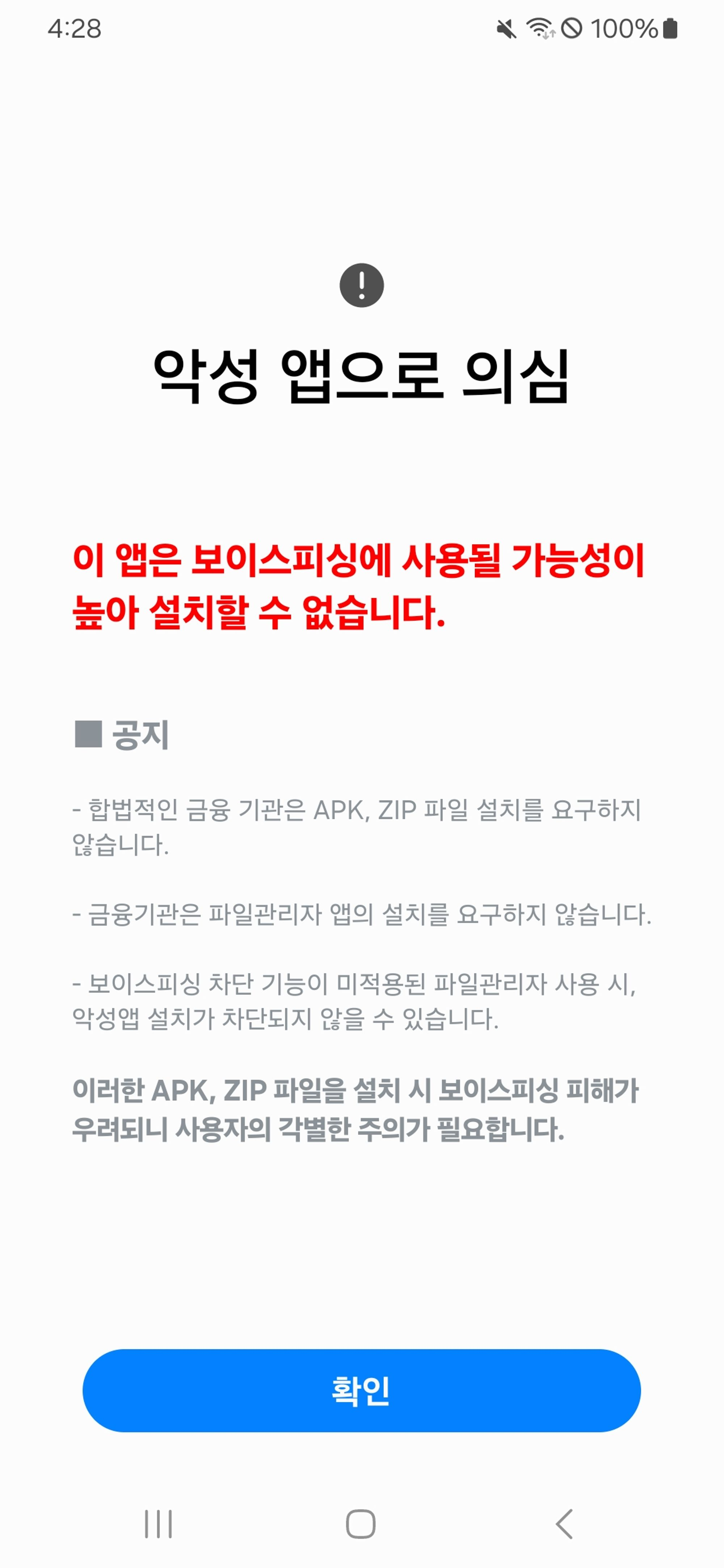 - 공식 앱 스토어(구글플레이, 앱스토어, 갤럭시스토어 등)가 아닌 다른 경로로 유입된 apk 파일에 대해서는 자체적으로 보안을 위해 설치가 제한된다는 내용이다.