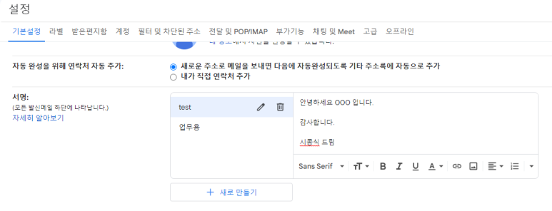 서명 템플릿이 적용되어 이미 작성된 내용이 표시된 것을 확인할 수 있습니다.