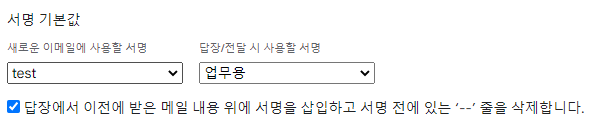 ** 새로운 이메일을 작성할 때는 test 템플릿으로, 수신된 이메일에 대한 답장을 작성할 때는 업무용 템플릿을 사용하도록 지정할 수 있습니다.(예시)