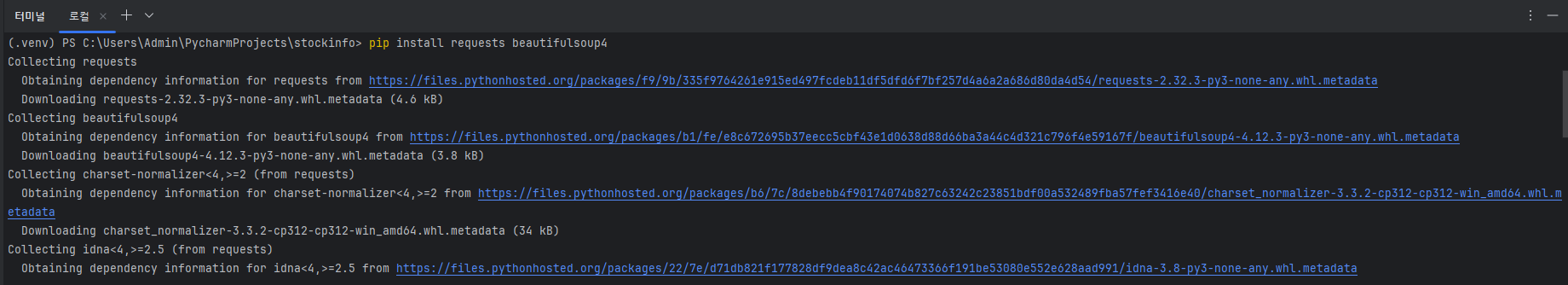 - 라이브러리(requests, beautifulsoup4) 설치