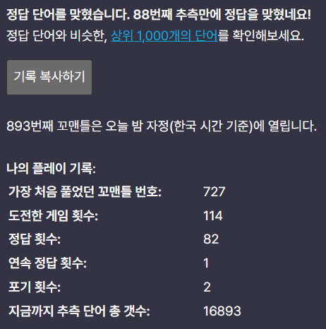 => 나의 플레이 기록을 확인할 수 있으며, 유사한 단어 1000개가 공개됩니다.